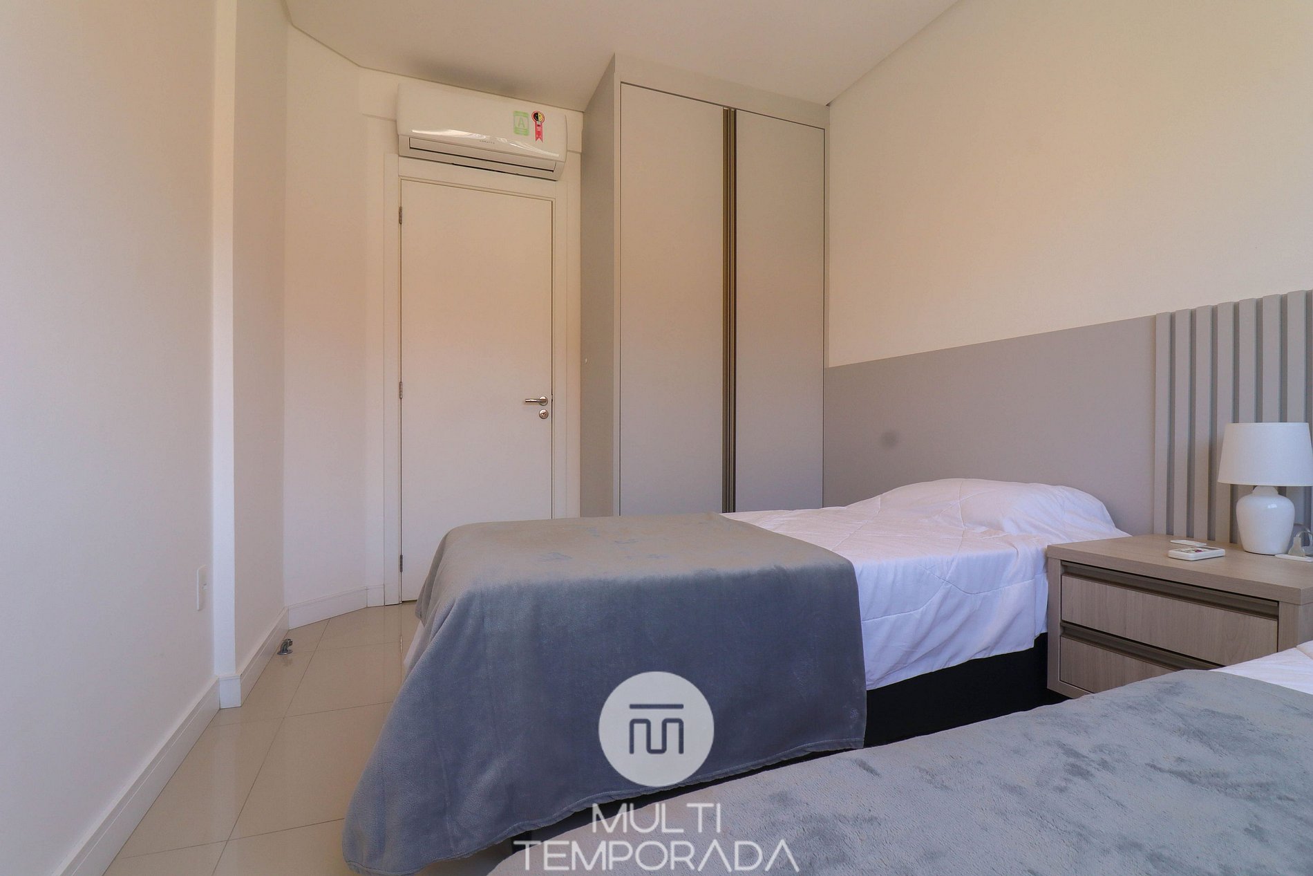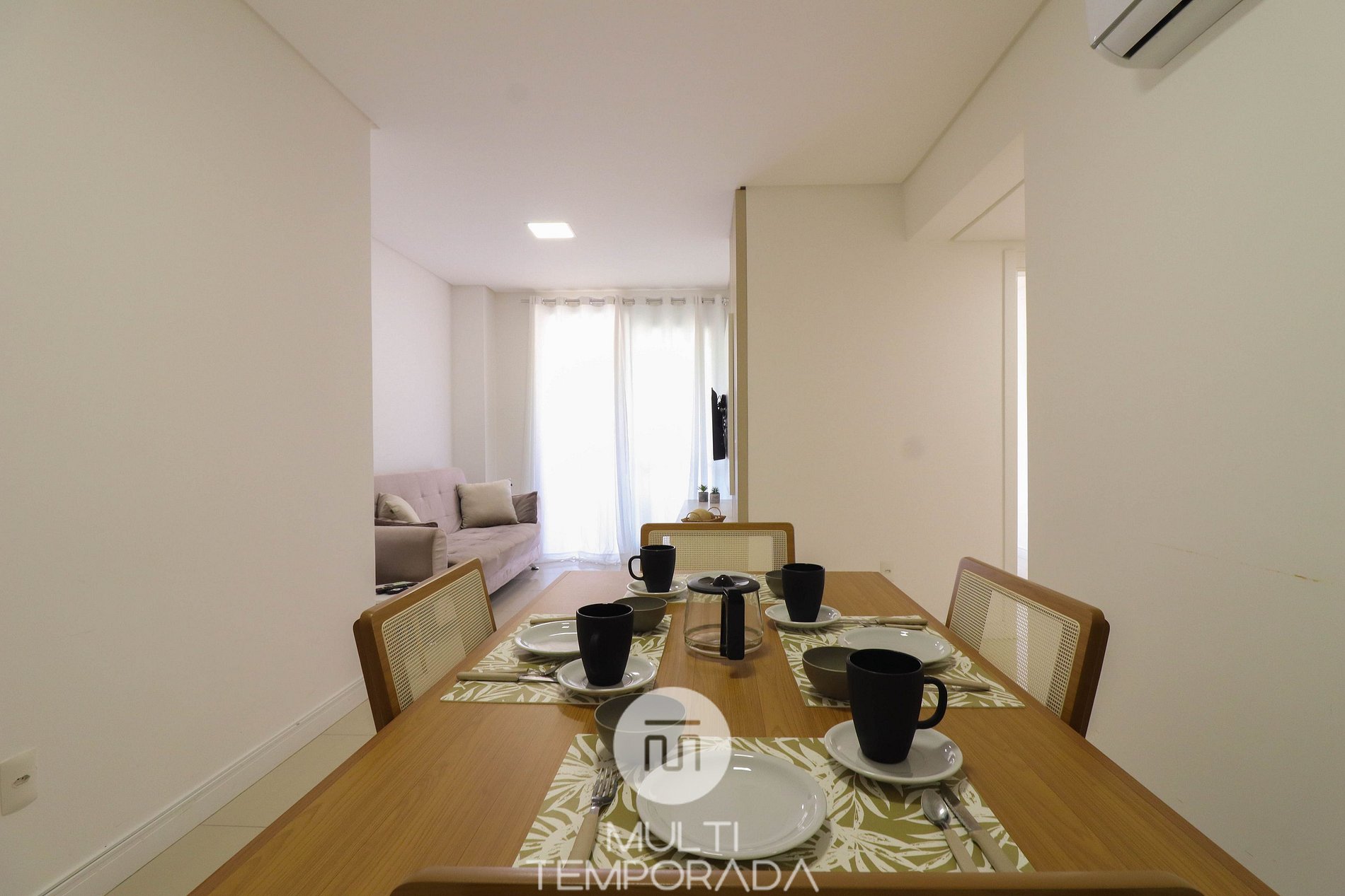 Ótimo apartamento, à 200 metros da praia, composto por dois dormitórios, sendo uma suíte com cama de casal, um quarto com duas camas de solteiro e cama auxiliar, todos os cômodos com ar condicionado, banheiro social, sacada com churrasqueira a carvão e pia, cozinha completa, área de serviço com máquina lava e seca e tanque. Possui uma vaga de garagem, conta com wi-fi e TV à cabo.