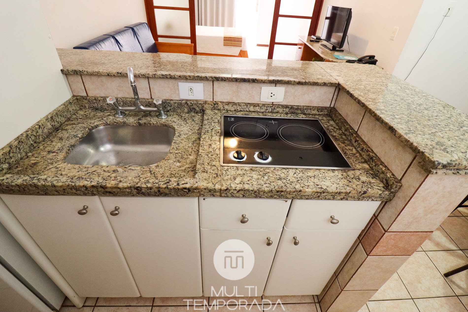 Apartamento Suíte - 1 dormitório com cama de casal, ar condicionado, 1 sala com dois ambientes, uma com sofá cama e outra com cama de casal, cozinha americana completa, 1 banheiro e sacada com churrasqueira com vista para o mar.