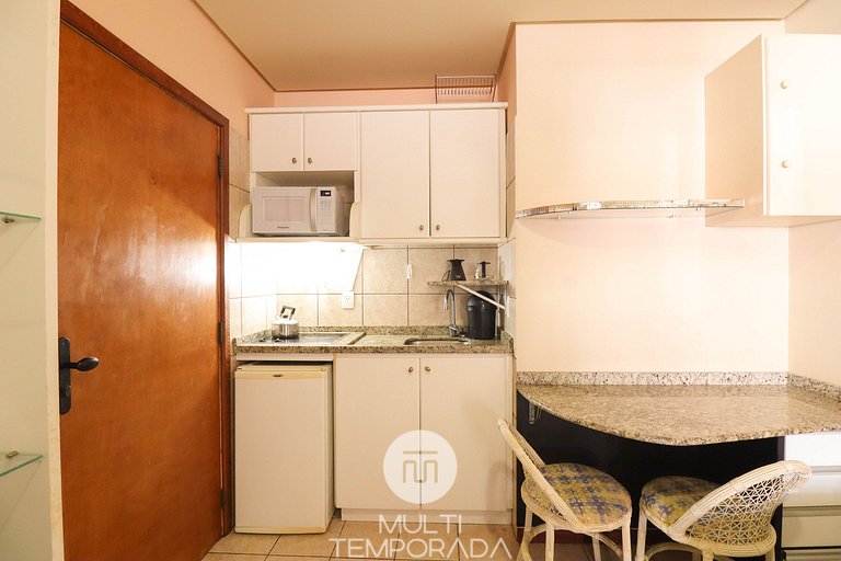 Apartamento Luxo - 01 dormitório com cama de casal, ar condicionado, sala com sofá cama, TV e cozinha (minibar, microondas, forno, fogão elétrico e itens básicos de cozinha) conjugada, 1 banheiro e sacada.