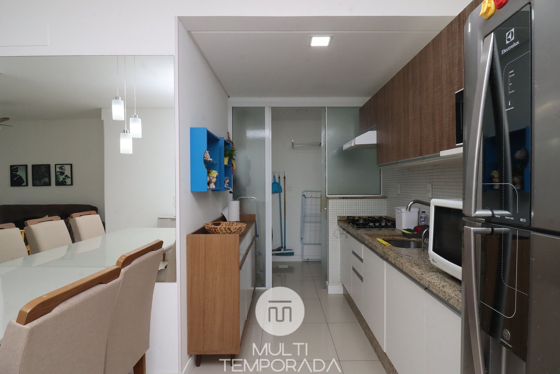 Belo apartamento, à 200 metros da praia, composto por dois dormitórios, sendo uma suíte com cama de casal e ar-condicionado, um quarto com duas camas de solteiro, uma cama auxiliar e ar-condicionado, sala com sofá-cama, banheiro social, sacada com churrasqueira e pia, cozinha completa, área de serviço com máquina de lavar e tanque. Possui uma vaga de garagem, conta com wi-fi e TV à cabo.