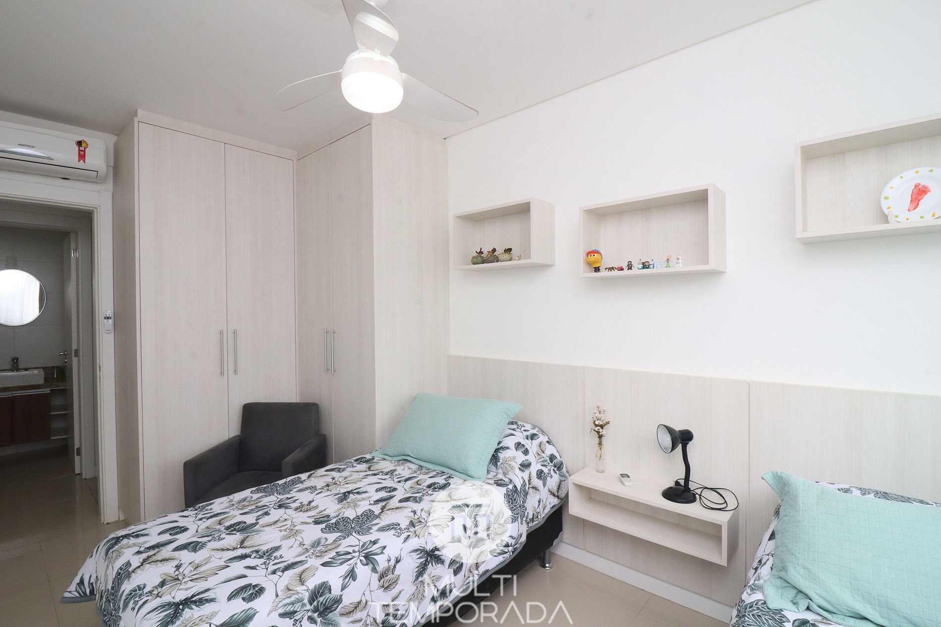 Belo apartamento, à 200 metros da praia, composto por dois dormitórios, sendo uma suíte com cama de casal e ar-condicionado, um quarto com duas camas de solteiro, uma cama auxiliar e ar-condicionado, sala com sofá-cama, banheiro social, sacada com churrasqueira e pia, cozinha completa, área de serviço com máquina de lavar e tanque. Possui uma vaga de garagem, conta com wi-fi e TV à cabo.