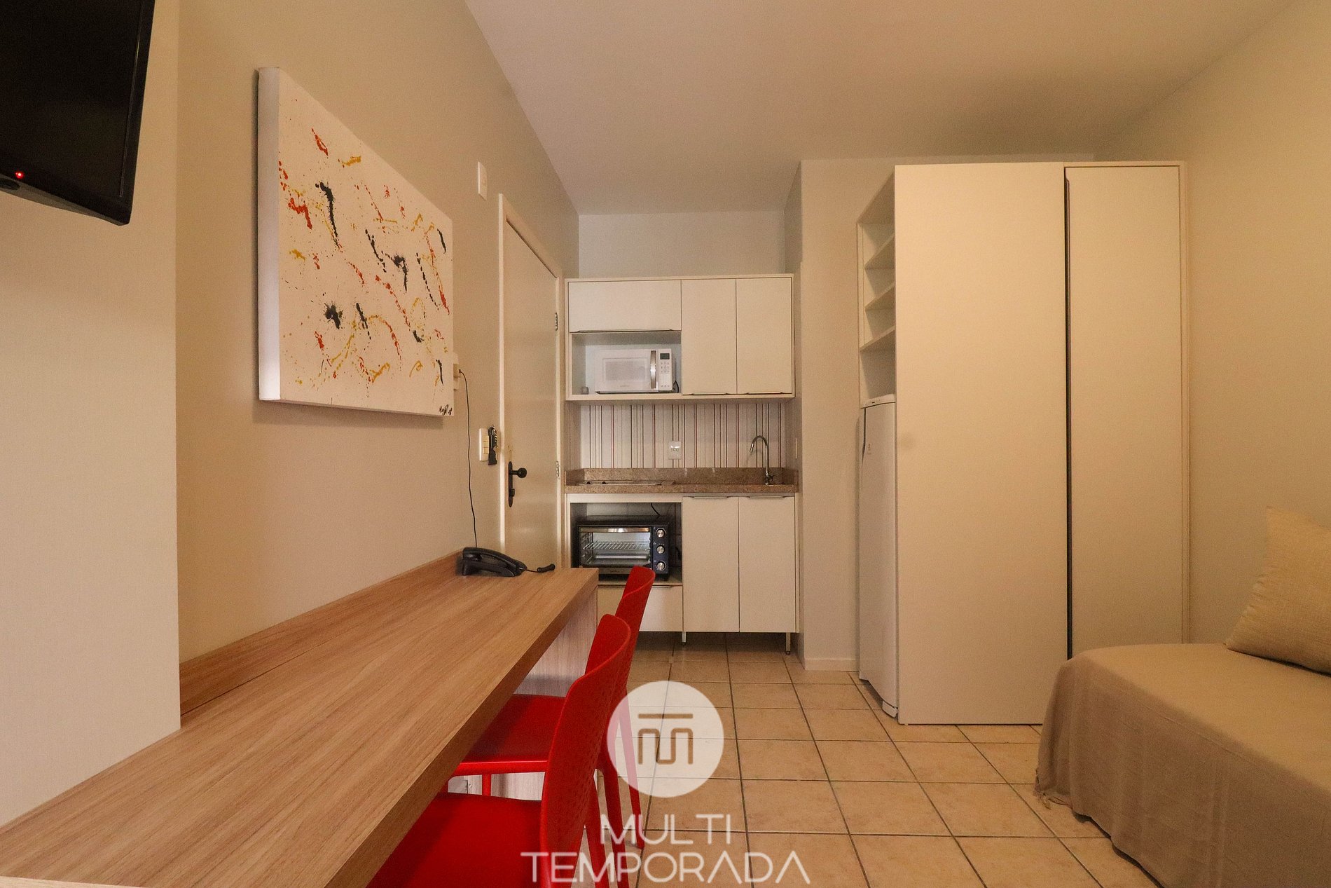 O apartamento é mobiliado, decorado e equipado com eletrodomésticos e utensílios para preparo de refeições, além de dispor de mantas e travesseiros para a sua maior comodidade.