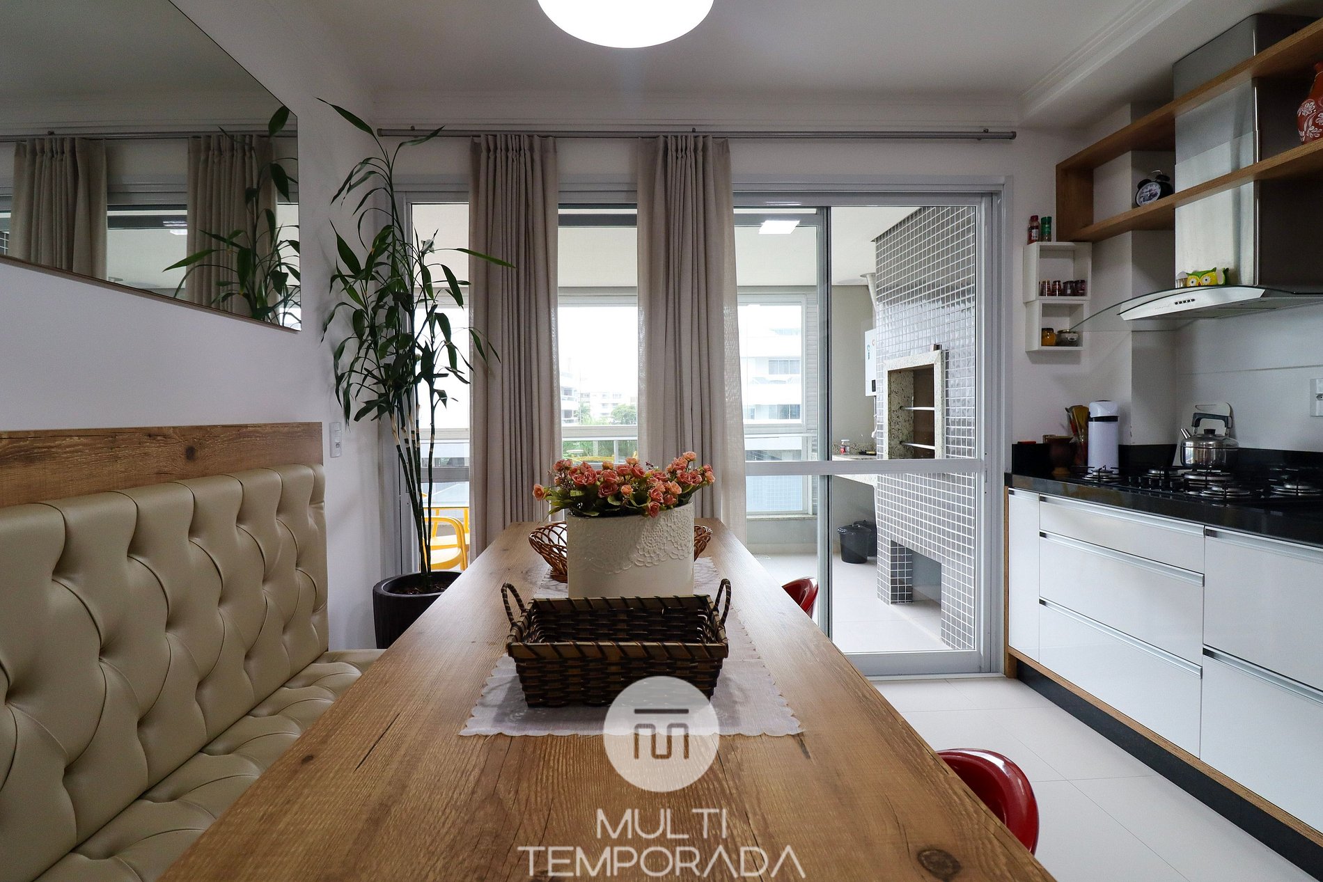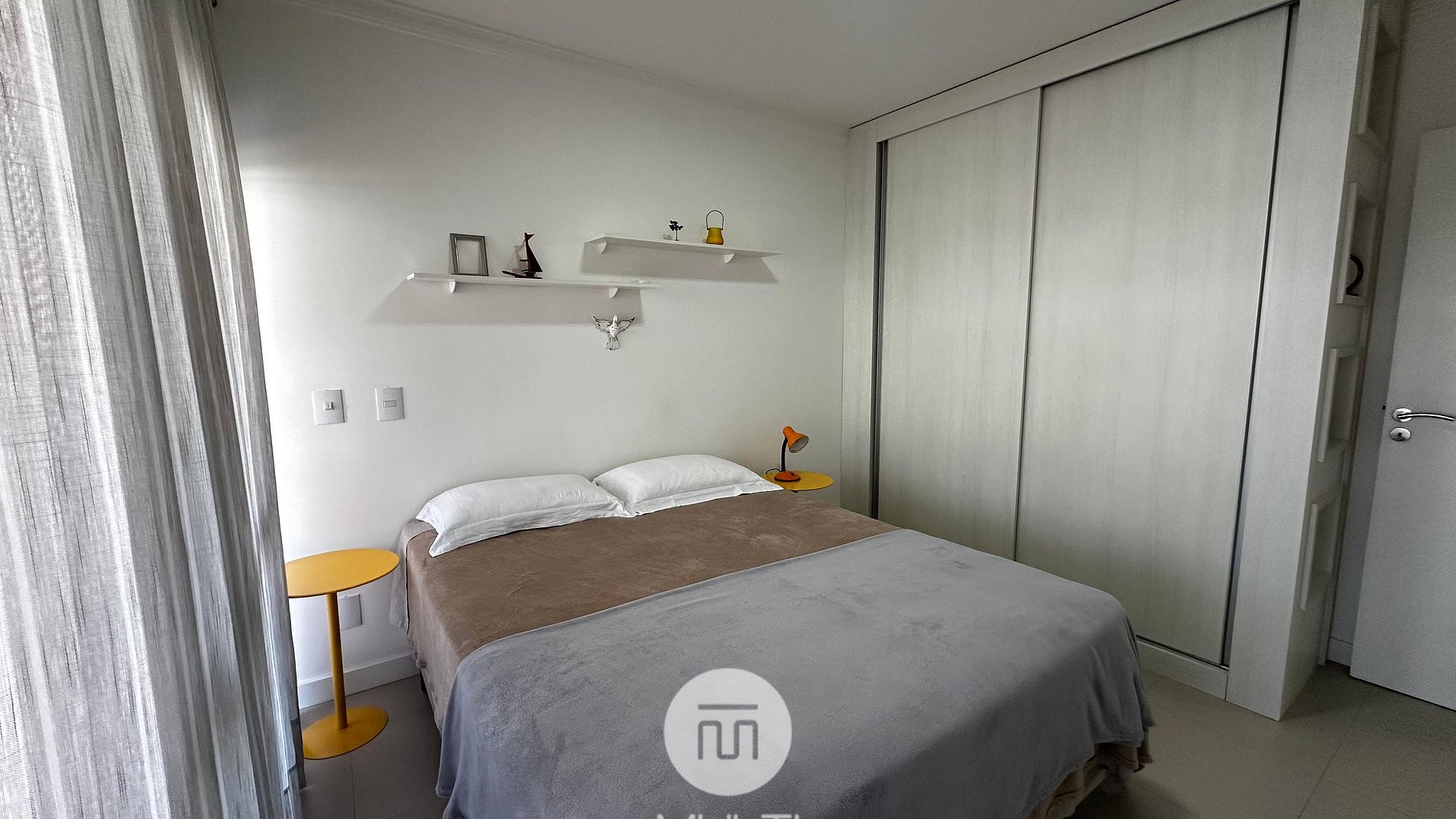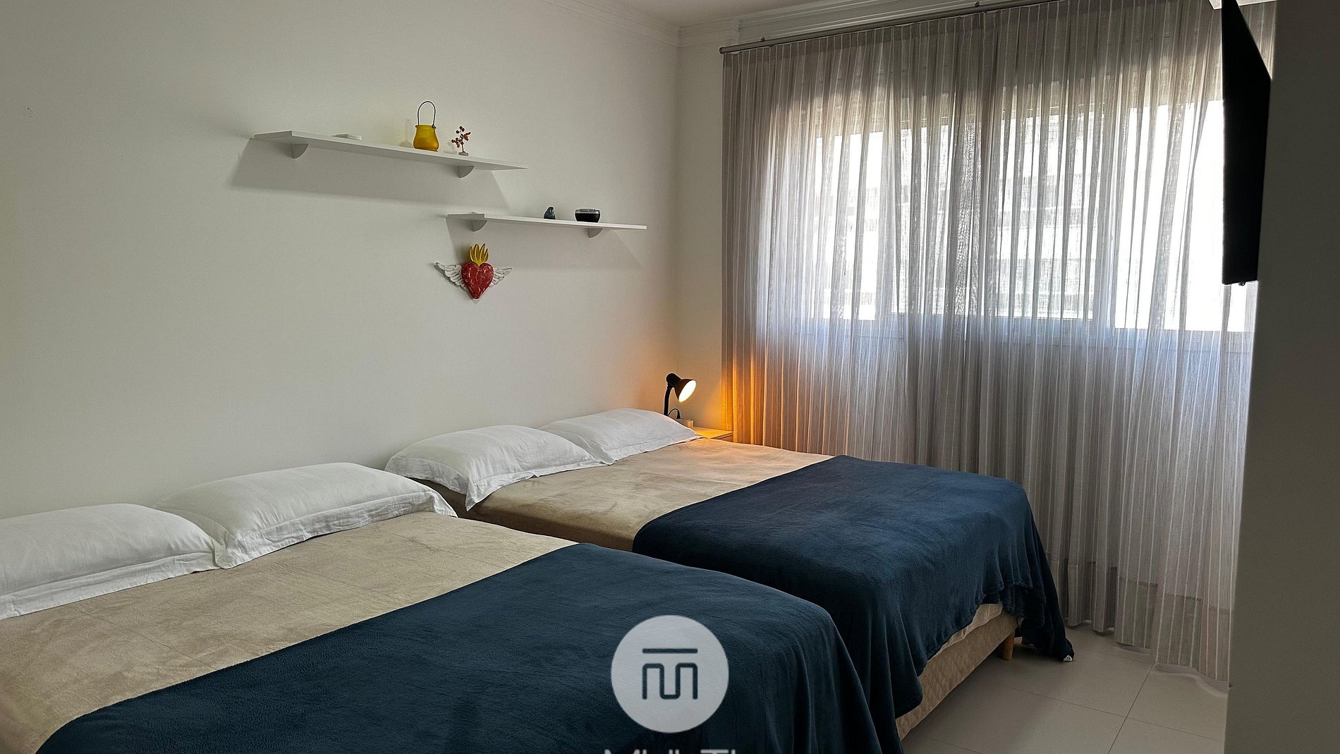 Espetacular apartamento, composto por 02 suítes, sendo uma suíte com duas camas de casal e outra suíte com cama casal queen size, todos os cômodos com ar condicionado e televisão, banheiro social, ampla sacada fechada com churrasqueira à carvão e pia, cozinha completa planejada. Possui duas vagas de garagem. Apartamento impecável com mobília planejada.