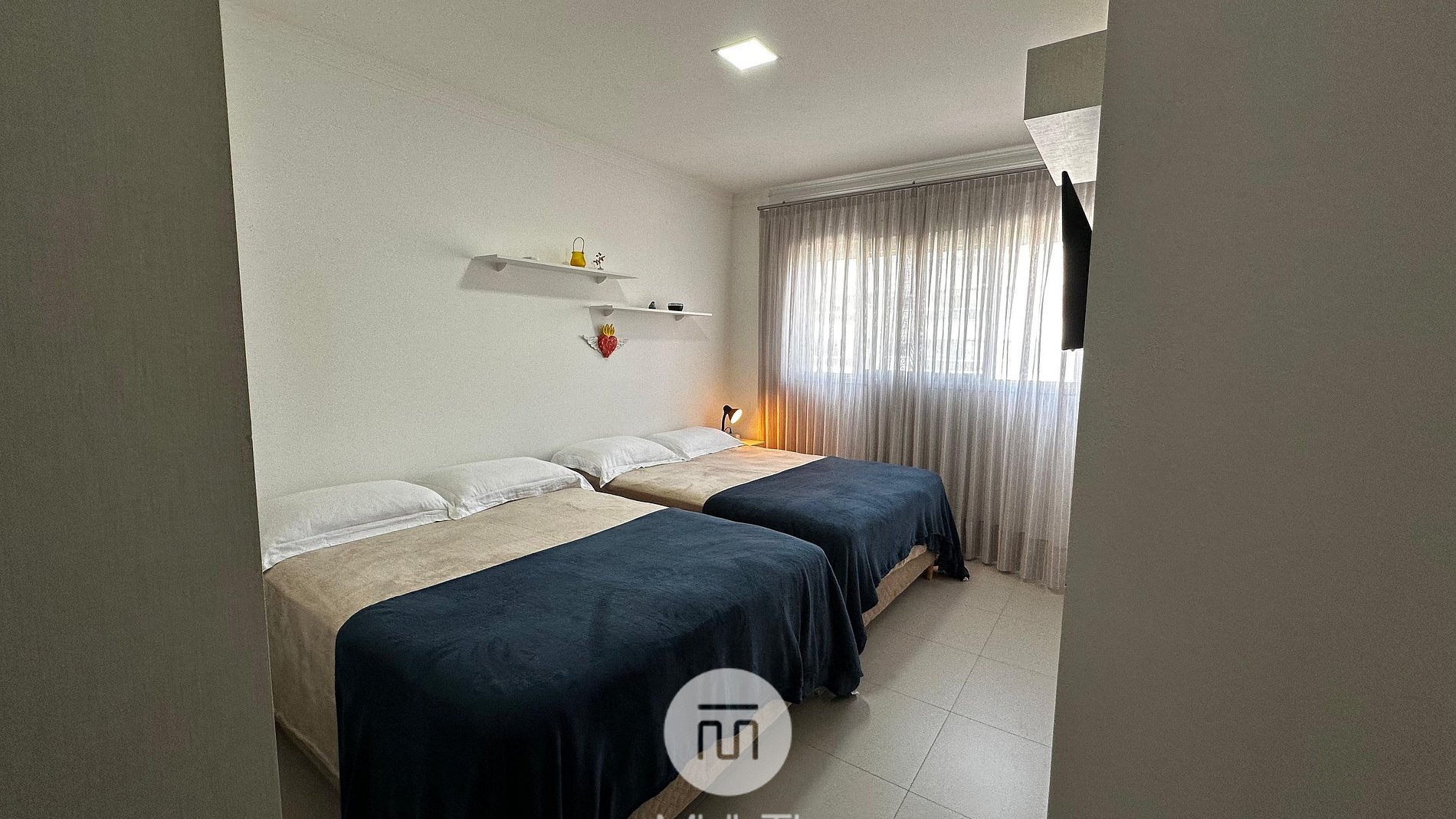 Espetacular apartamento, composto por 02 suítes, sendo uma suíte com duas camas de casal e outra suíte com cama casal queen size, todos os cômodos com ar condicionado e televisão, banheiro social, ampla sacada fechada com churrasqueira à carvão e pia, cozinha completa planejada. Possui duas vagas de garagem. Apartamento impecável com mobília planejada.