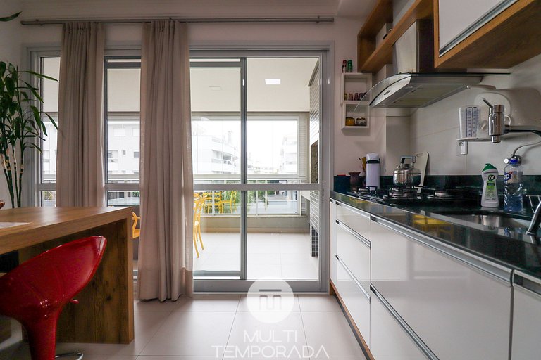 Espetacular apartamento, composto por 02 suítes, sendo uma suíte com duas camas de casal e outra suíte com cama casal queen size, todos os cômodos com ar condicionado e televisão, banheiro social, ampla sacada fechada com churrasqueira à carvão e pia, cozinha completa planejada. Possui duas vagas de garagem. Apartamento impecável com mobília planejada.