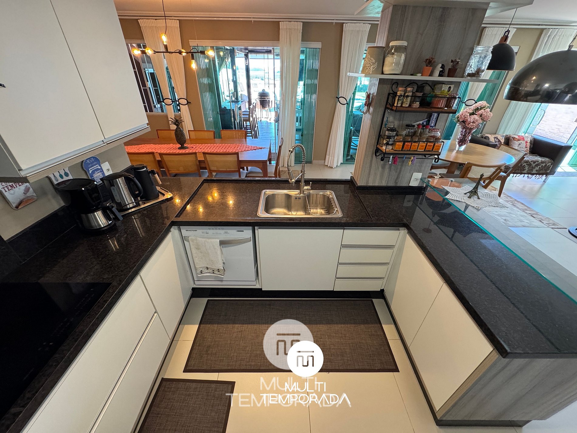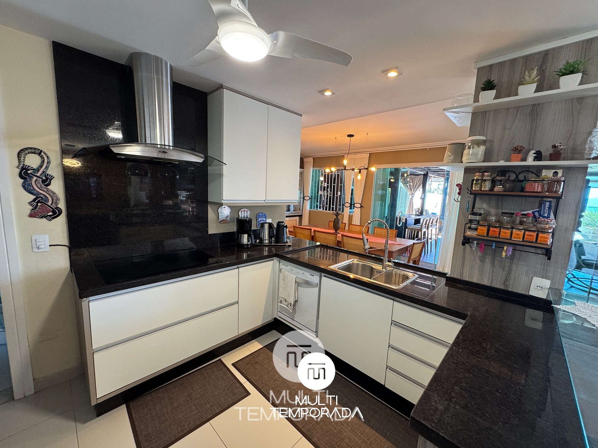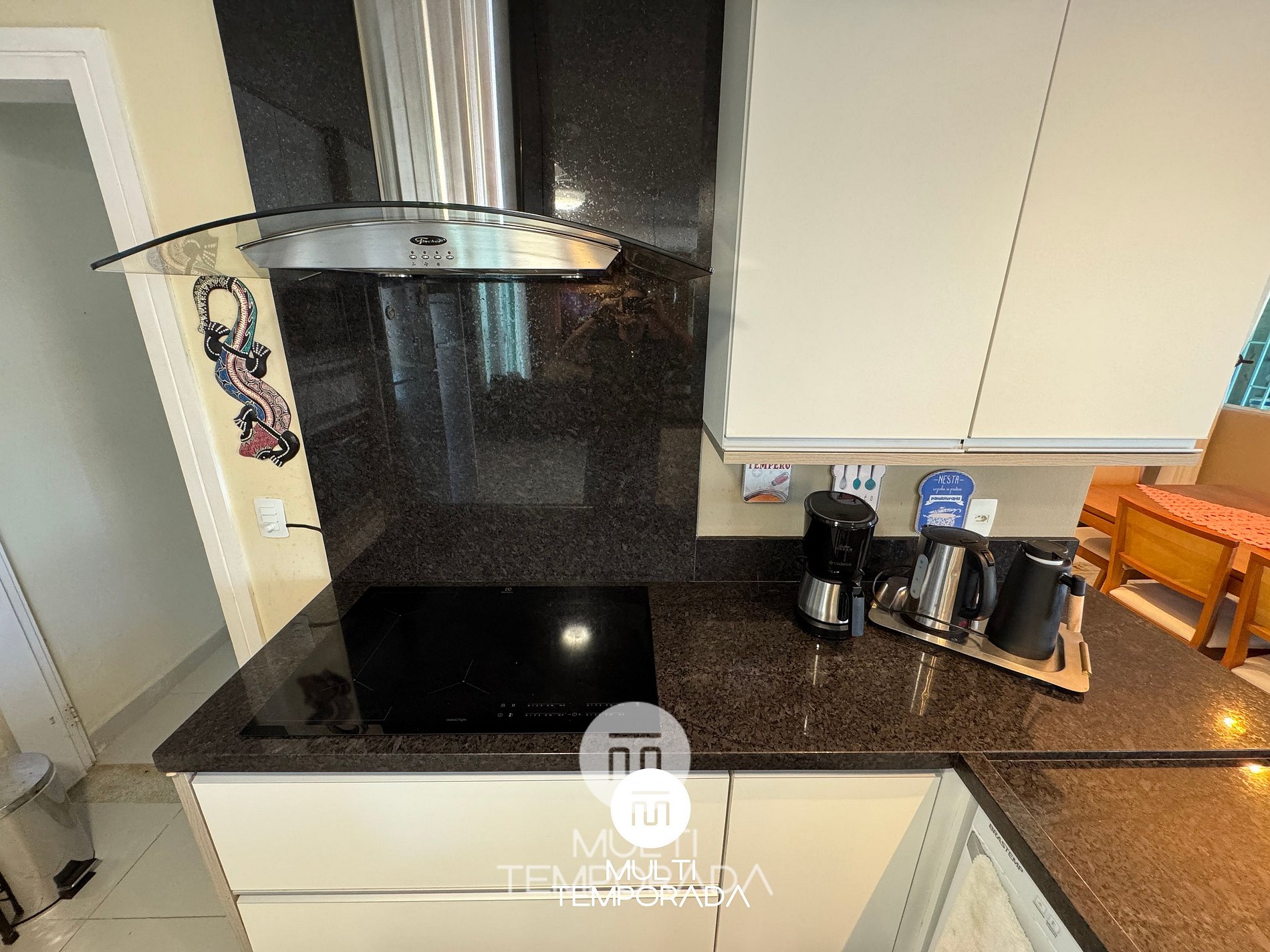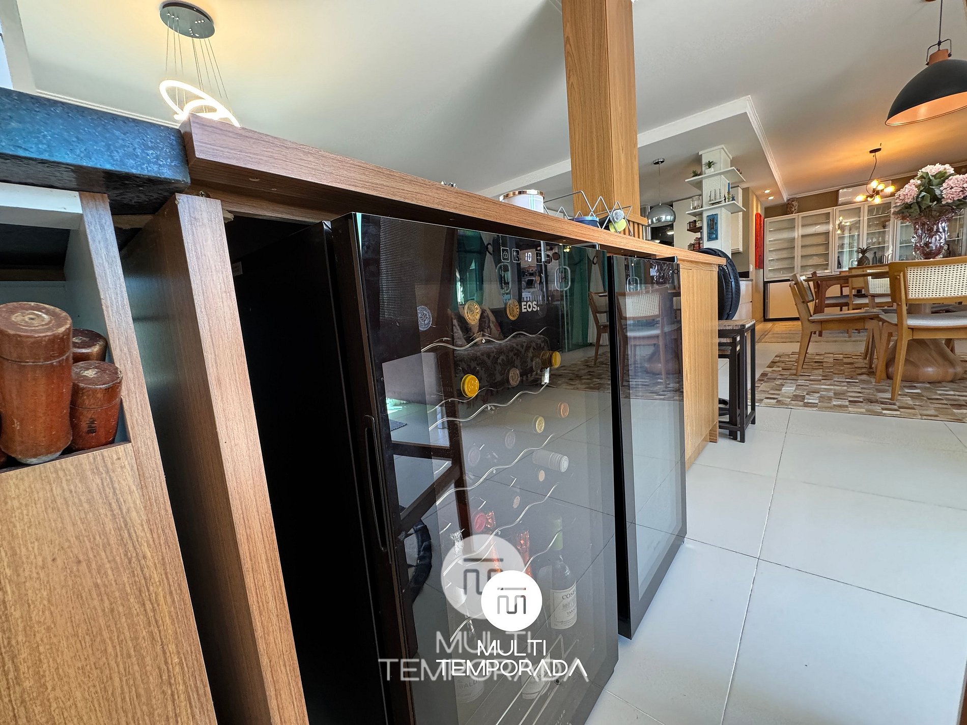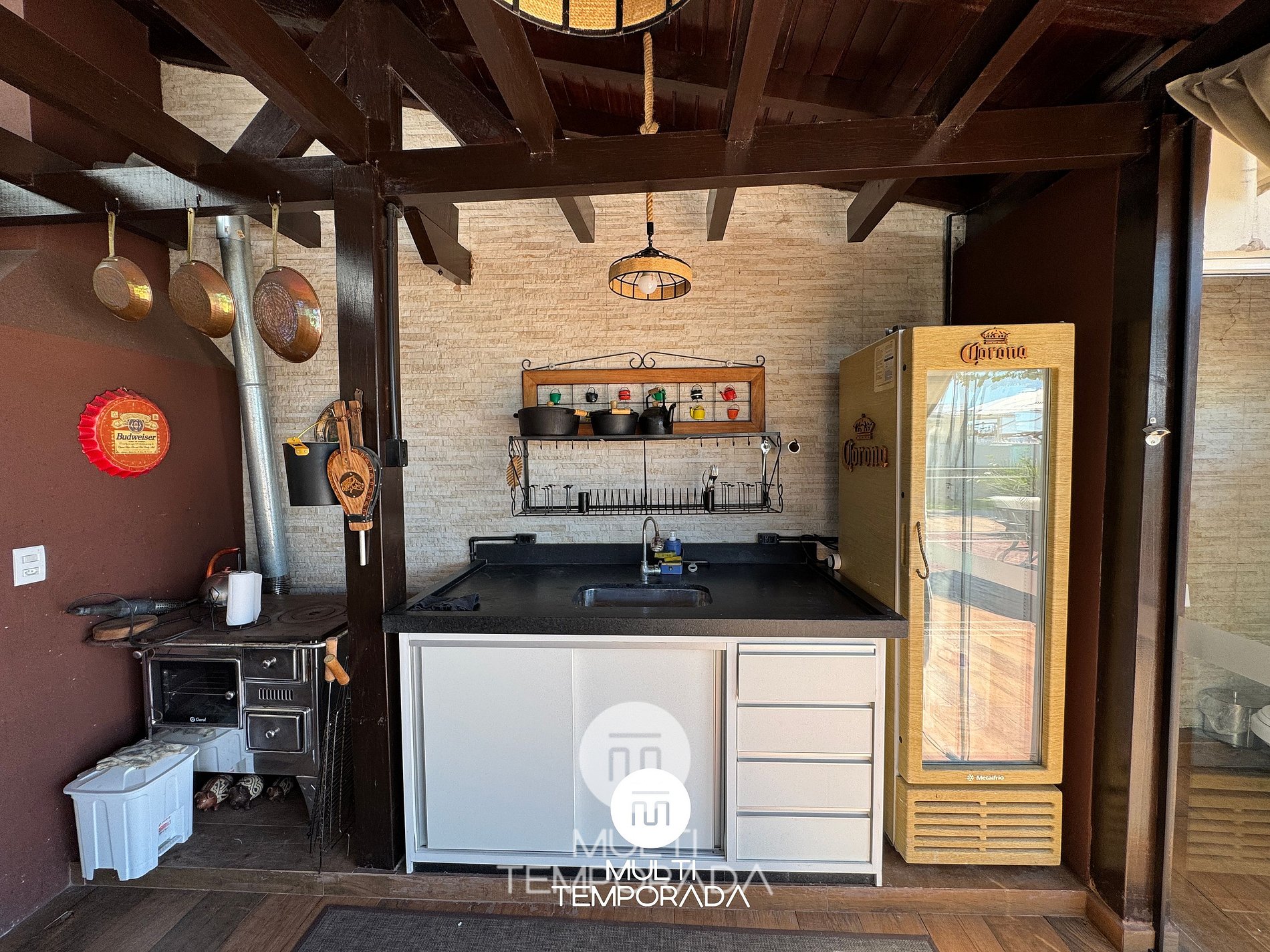 A cozinha planejada reúne praticidade e sofisticação, equipada com fogão de indução com travas de segurança, geladeira, forno, micro-ondas, lava-louças, freezer vertical e horizontal, além de adega climatizada e duas cervejeiras — perfeita para estadias completas, desde jantares intimistas até encontros familiares.