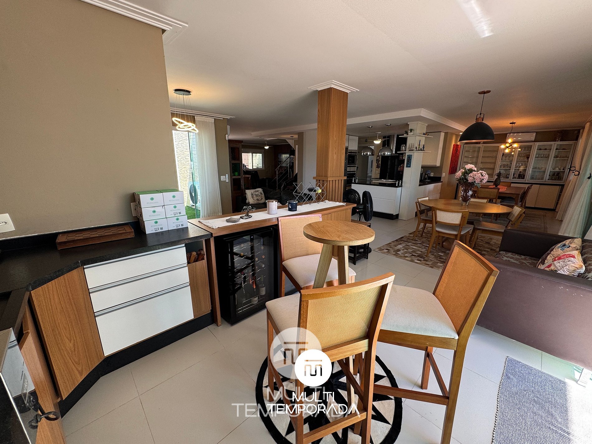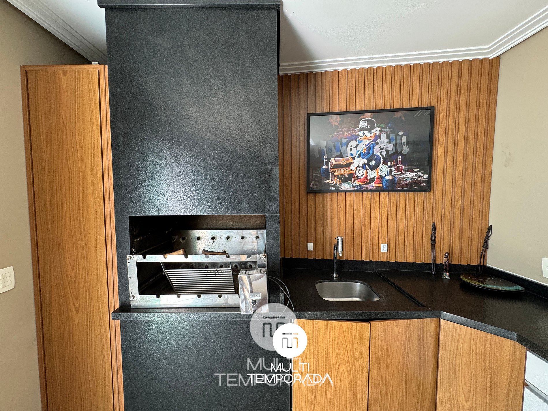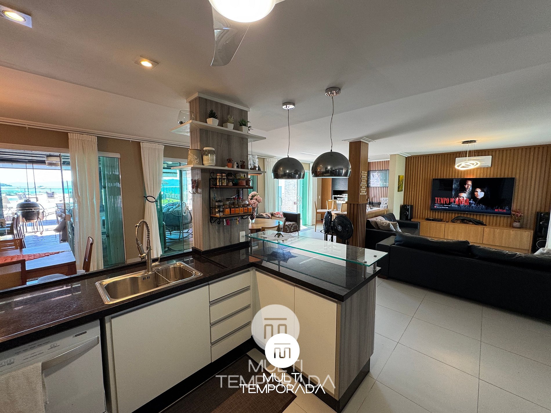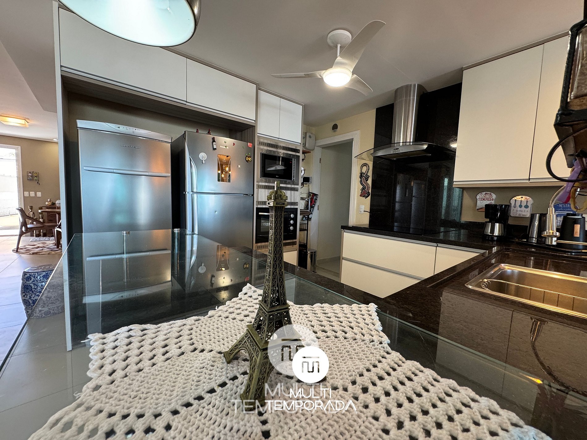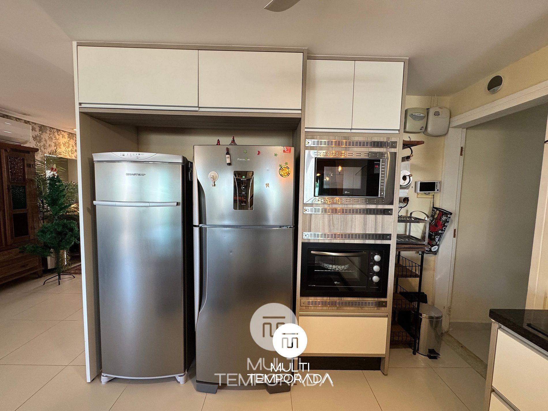 A cozinha planejada reúne praticidade e sofisticação, equipada com fogão de indução com travas de segurança, geladeira, forno, micro-ondas, lava-louças, freezer vertical e horizontal, além de adega climatizada e duas cervejeiras — perfeita para estadias completas, desde jantares intimistas até encontros familiares.
